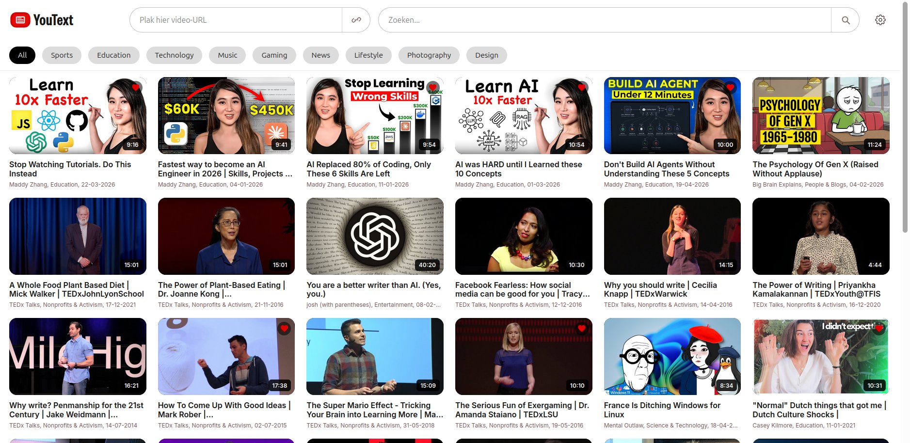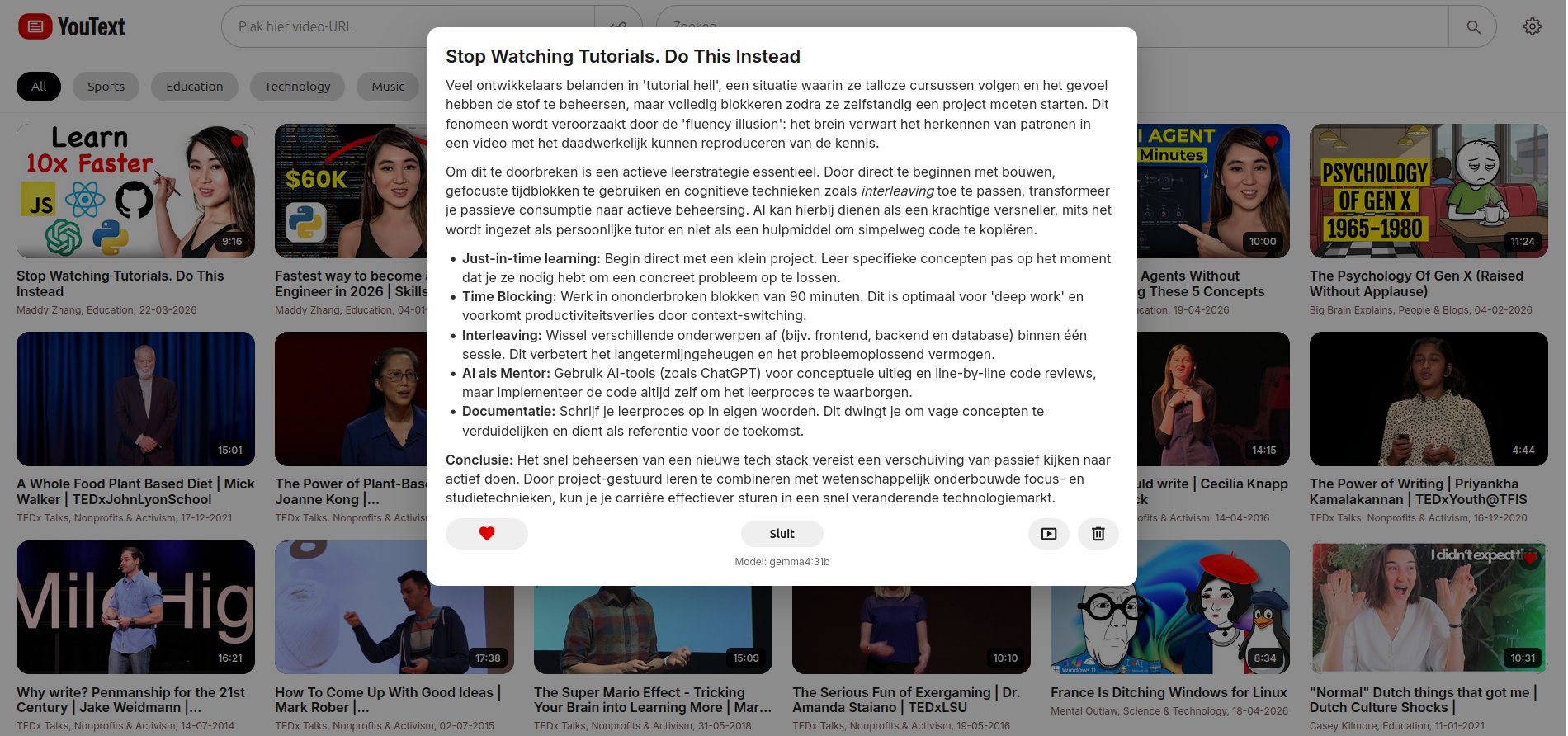 Het tool maakt samenvattingen van YouTube-videos (en videos van andere videosites) zodat ik kan lezen. En slaat deze samenvattingen op in een digitale bibliotheek van teksten.